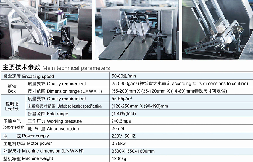 本產品是我公司結合國外裝盒機的先進技術及根據國內制藥行業的實際情況而研發的擁有新型、具有先進的多功能自動裝盒機,是機、電、氣光一體化的高科技產品。本產品適用于鋁塑藥板、瓶、口服液、鋁/塑管、面膜、及各類電子、日用品等以及相類似物品的裝盒包裝,具有自動完成使用說明書的折疊、紙盒自動打開、物品裝盒、打印批號、封盒等功能。該機可以單獨使用亦可以與其他設備聯動使用,形成聯動生產線。